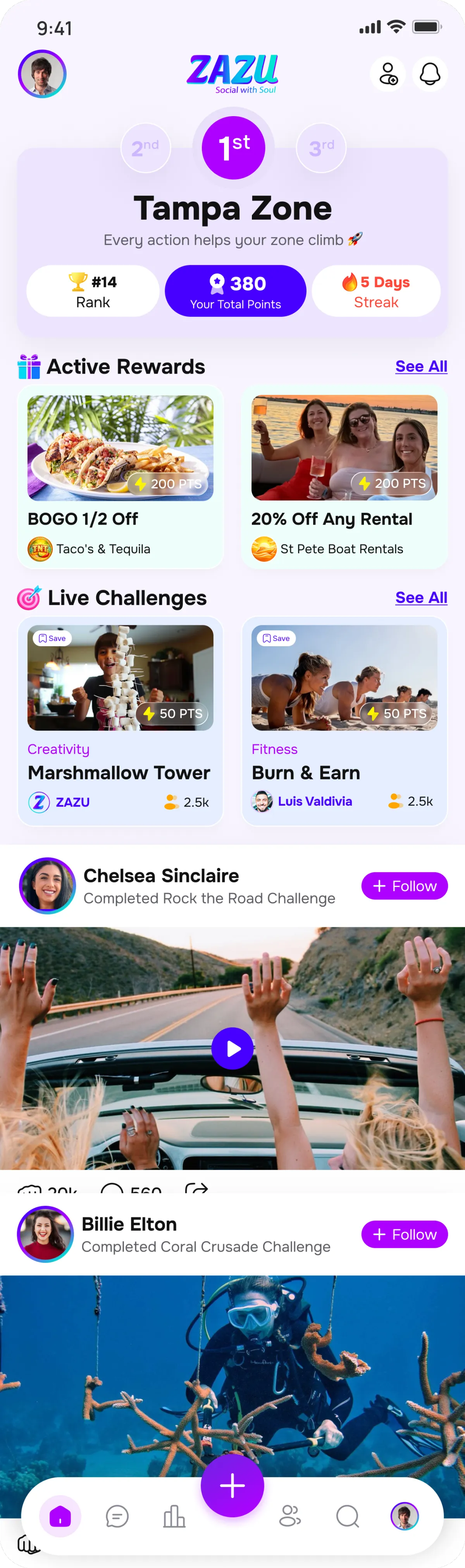 ZAZU is a new sport—a social gaming app where real life is the playing field. Creators create challenges, businesses reward action, players earn perks, and cities rise on the leaderboard together.